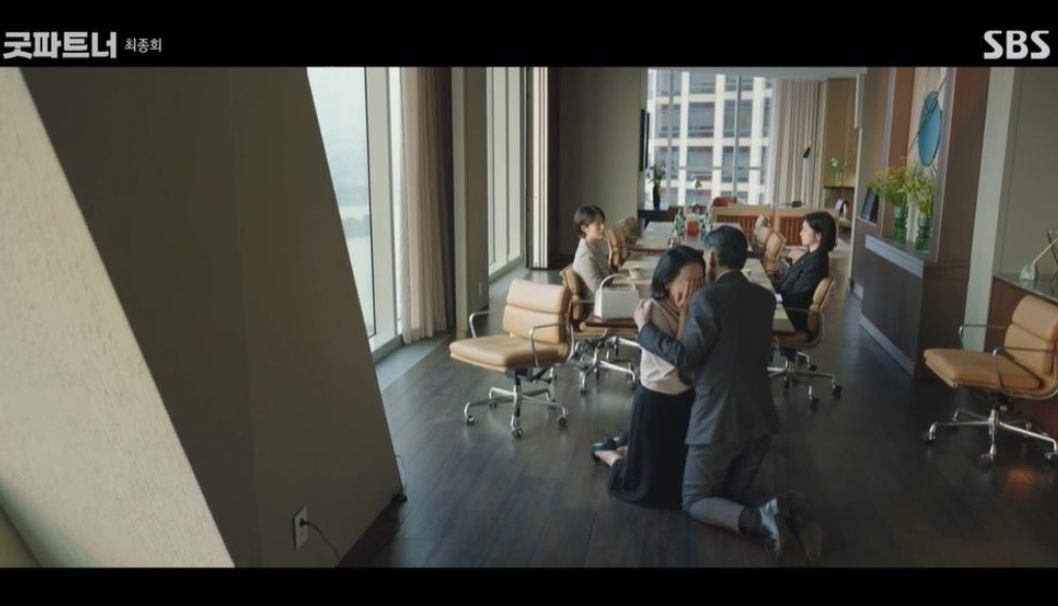 신입변호사는 사건을 잘 해결해 나가고, 유리가 조언해준 시계도 준비해 오면서 점점 성장해 가고 그런 신입 변호사를 보는 유리는 뿌듯해집니다. 이후 상간녀가 5명인 사건의 원고와 피고측 대리인으로 유리와 은경은 법정에서 다시 맞붙게 됩니다. 한유리는 법정에서 나오며 “합의할 의사는요?”라고 묻고는 “그럼 떡볶이 같이 드실 의사는요?”라고 물었다. 차은경은 “그건 있어”라고 답하며 웃으며, 서로가 서로의 굿파트너임을 이야기하며 드라마는 종료됩니다.
